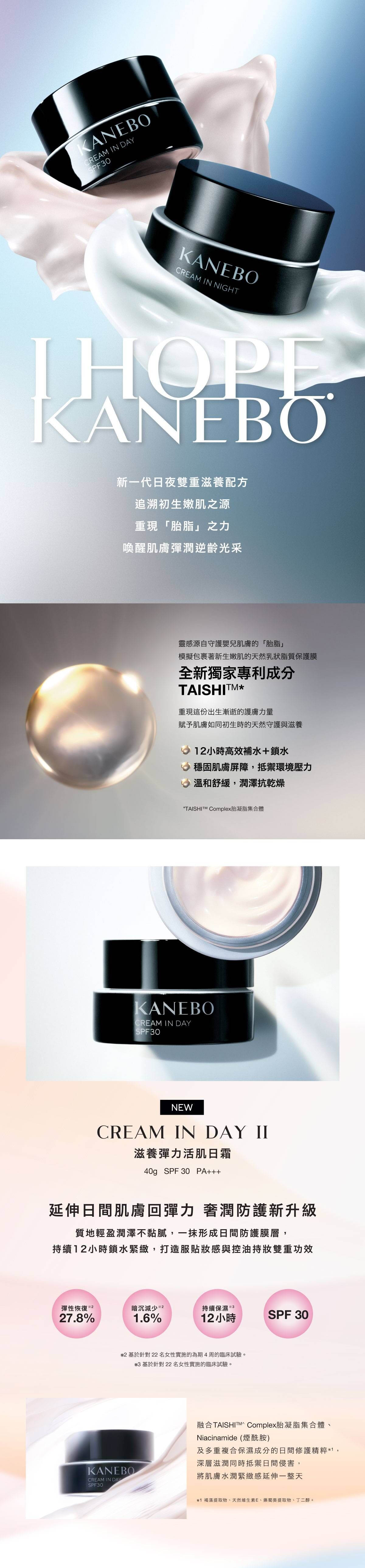 配方蘊含專利研發的 TAISHI™ Complex*,結合SPF30防禦屏障,形成柔潤彈性「日間防護膜層」,12小時全天候守護肌膚避免日間侵害。